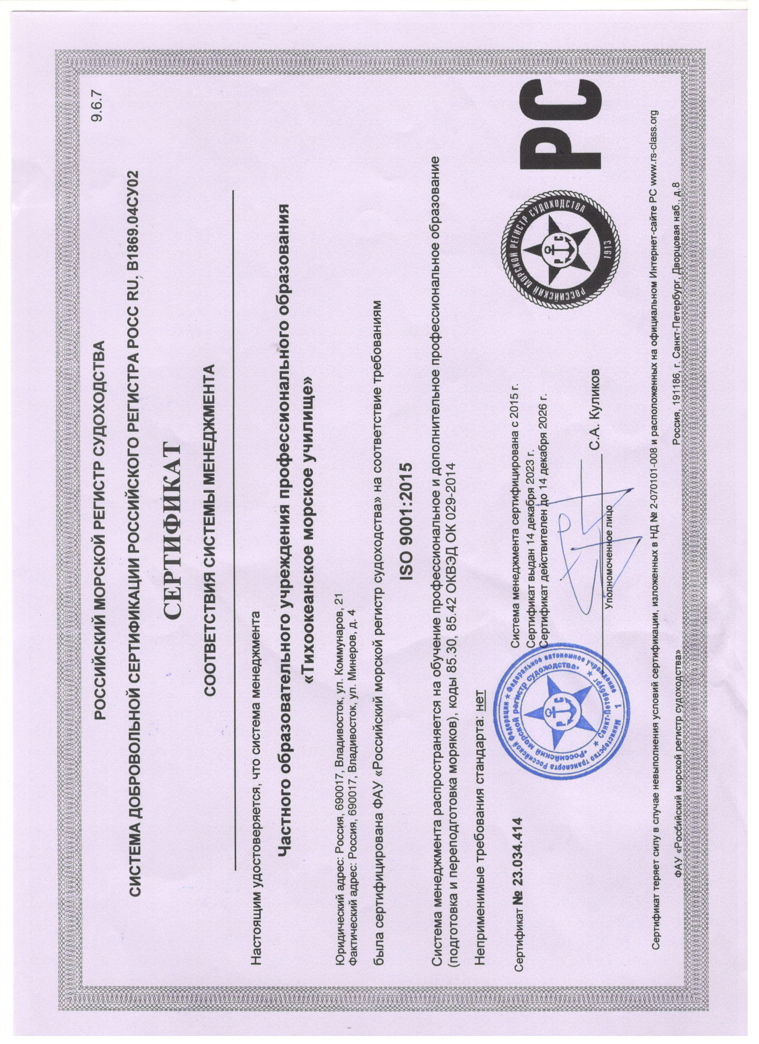 6. Сертификат ФАУ "Российский морской регистр судоходства" на соответствие требованиям ISO 9001:2015 № 23.034.414 от 14 декабря 2023 года: