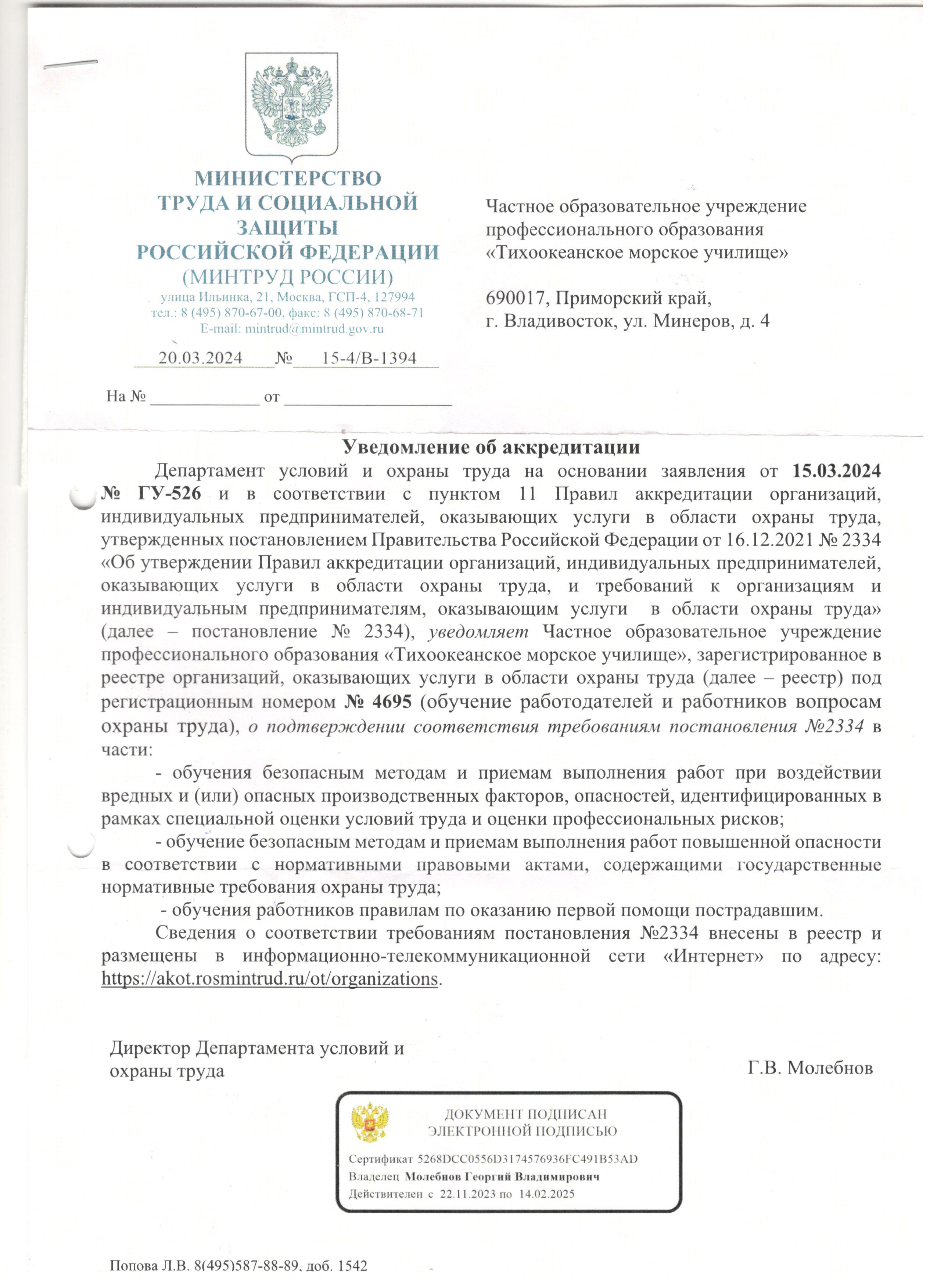 3. Уведомление о внесении в реестр аккредитованых организаций, оказывающих услуги в области охраны труда от 20.03. 2024 г. № 15-4/В-1394: